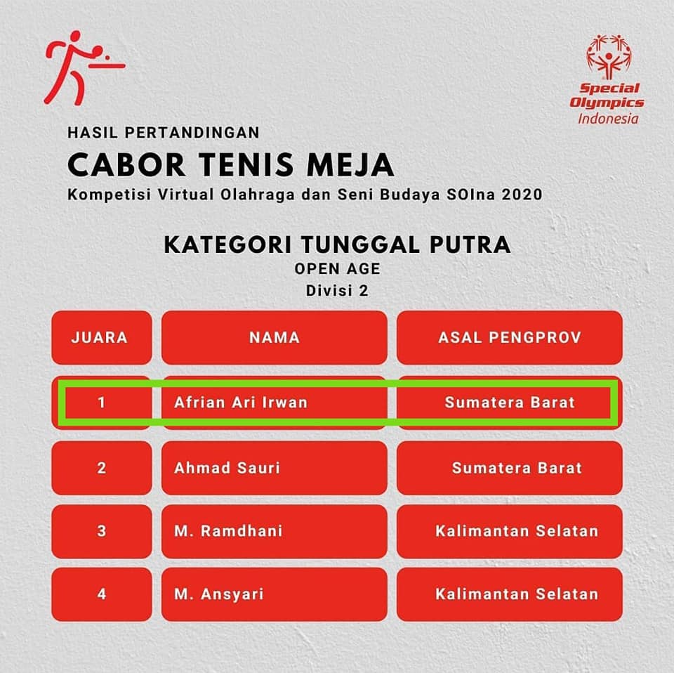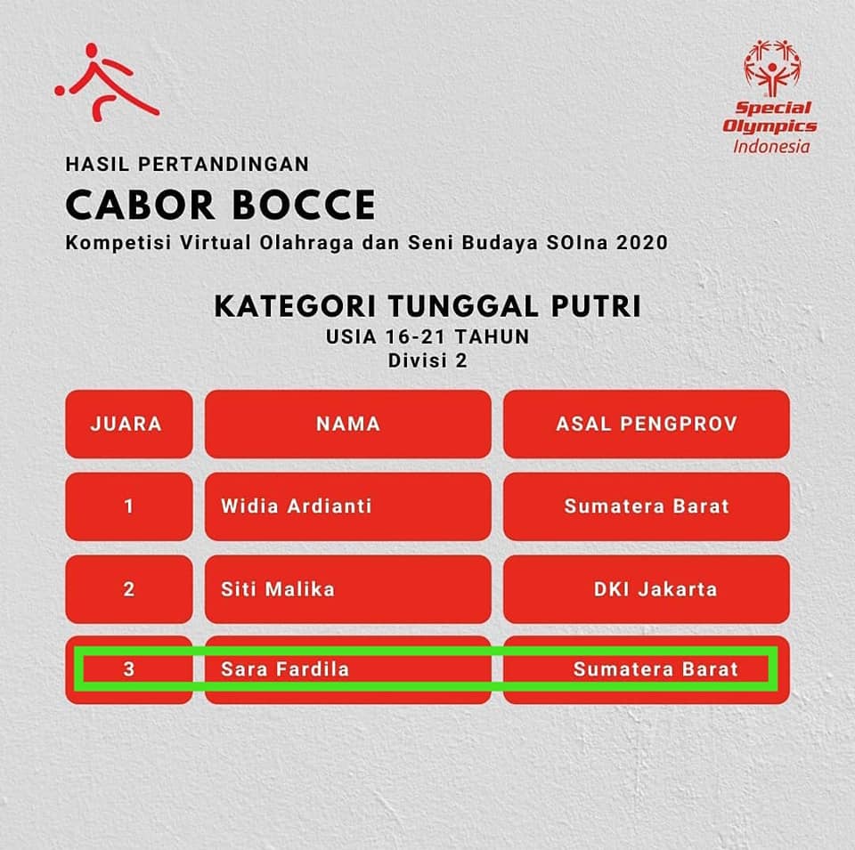 Kompetisi Virtual Olahraga dan Seni Budaya SOIna Tingkat Nasional Tahun 2020 Januari 12, 2021 Prestasi Selamat untuk siswa dan siswi SLB Aisyiyah Sijunjung atas prestasi yg telah diraih juara 1,2 dan 3 dalam Kopetisi Virtual Olahraga dan Seni Budaya SOIna Tingkat Nasional Tahun 2020 Tag: kompetisivirtual, lomba, slbaisyiyahsijunjung, SOINA